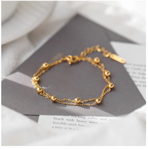 Gold Plated Double Layer Chain Bracelet For Girls| Luxury Korean Style Faux Pearl Ball Link Chain Charm Bangle Bracelet For Women| Stainless Steel Double Chain Simple Stylish Bracelet Fashion Jewelry